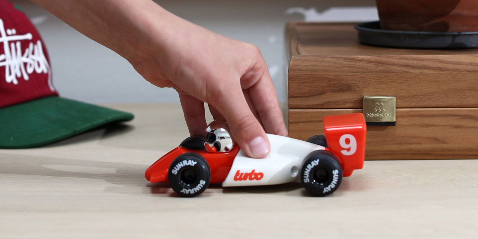 An adult would hold these with two hands. These are first toys we ever designed. Makes for a great display piece as well as a toy to play with.
